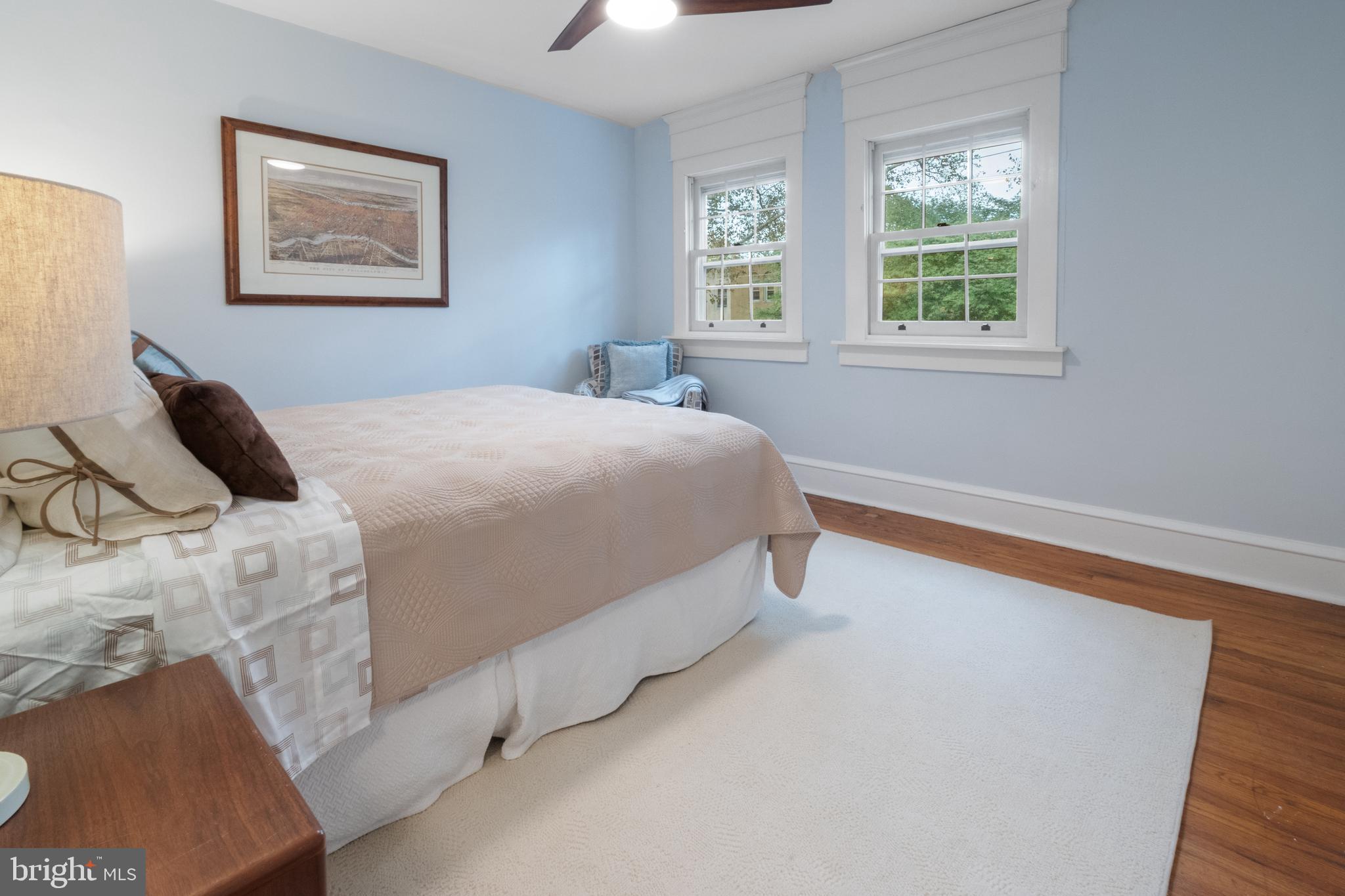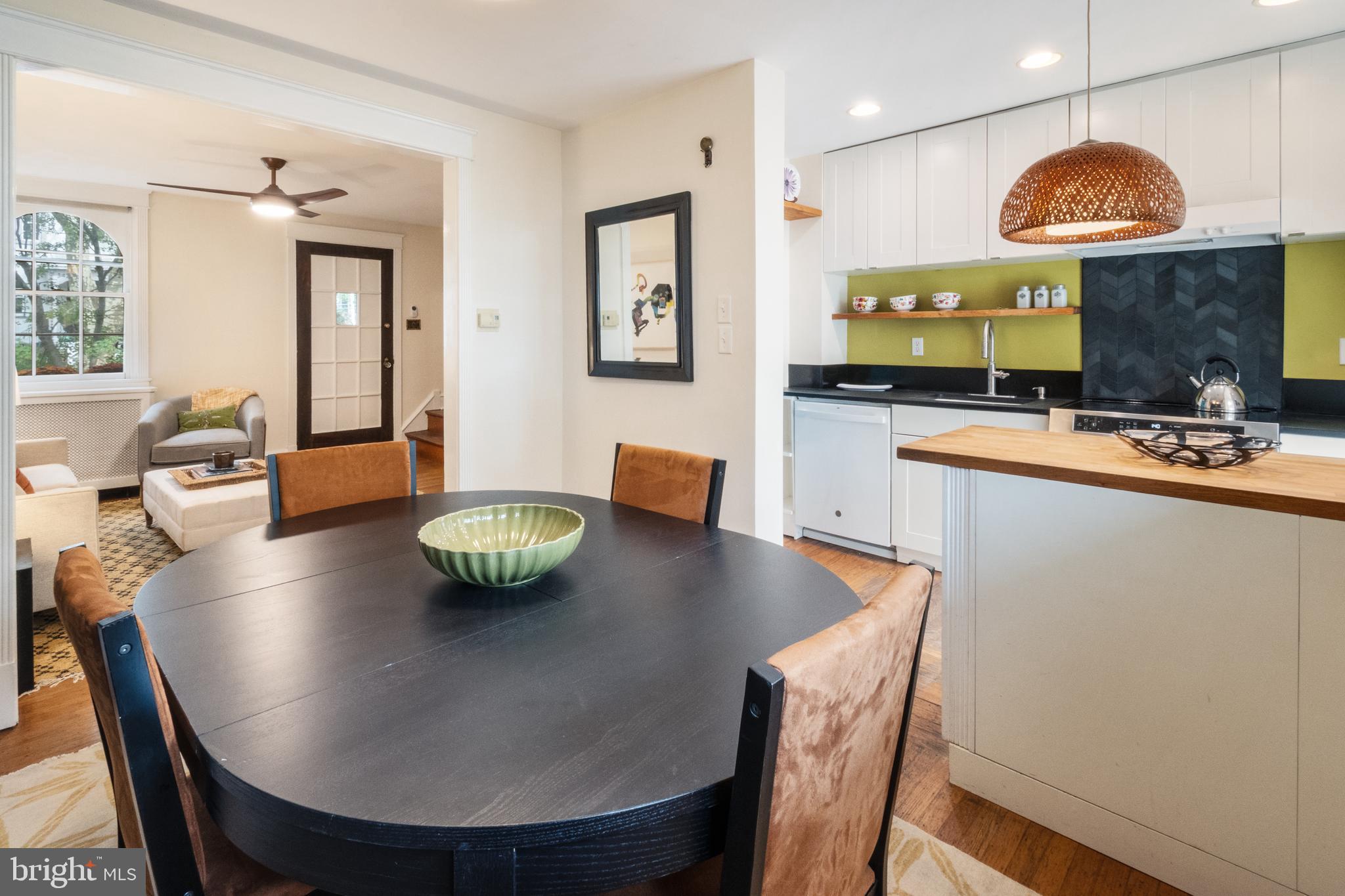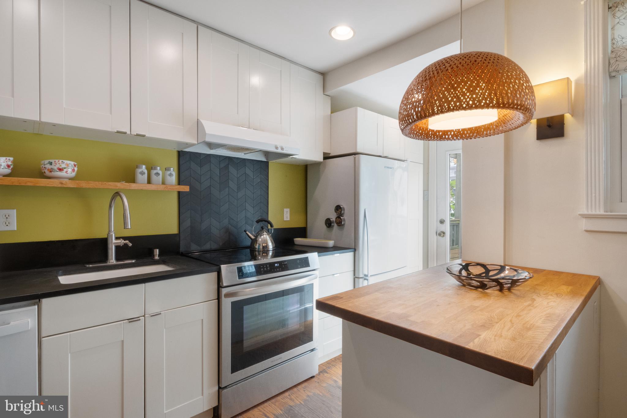 Step in under the sycamore canopy and discover this lovely porch front row home overlooking the only block of Osmond St in the city! The bluestone steps and walk lead up past a layered shade garden to an open covered porch, screened by mature Japanese maple trees. The porch offers plenty of space for outdoor seating and the elevation above the sidewalk, long season foliage, and copper rain chain contribute to high levels of enjoyment in all weather. Upon entering the house, you are greeted by an open floor plan, original hard wood floors and loads of light. One large original window looks out over the front walkway, while the dining room, kitchen and bedrooms all have newer windows. The original galley kitchen was opened to the dining room by removing a wall and adding a large island with butcher block top and wide drawers. The kitchen has a newer induction top electric stove with convection, tiled backsplash, a deep farmhouse enamel sink with tall sprayer faucet, and black Richlite countertops. There are plenty of upper and lower cabinets as well as a pegboard for hanging all your pots and pans, a dishwasher and retro refrigerator with bottom freezer. The recessed lighting and full glass door bathe the kitchen in light. The kitchen door opens to a spacious deck with built-in garden boxes as well as a beautiful pergola with native honeysuckle vine and mature concord grapevine, plus loads of room for hanging plants. The basement level includes the laundry room with washer, dryer, and utility sink. A brand new boiler is being installed the week of 10/6, and the hot water heater which is 1 year old. The original garage, accessed off the alley, has been utilized as a workshop and storage space but could be easily returned to garage use. Outside there is driveway parking for 2 cars. The second floor has 2 large bedrooms with hard wood floors and ample closet space. The bathroom has a beautiful hexagonal tiled floor in varying shades of gray/green along with an updated vanity, original built-in medicine cabinet, newer toilet, and original tub shower. The original subway tile wainscot has been accented with a new green ceramic tile surround. The whole bathroom is filled with light from the operable skylight window. East Falls is a wonderful neighborhood which offers close proximity to both center city and the Wissahickon Valley portion of Fairmount Park. From Osmond Street it is a short walk to the Nouvaux Market, Falls of the Schuylkill Library, the East Falls Farmers Market, and the Schuylkill River Trail. The Fallser Club is a growing local music venue, and the neighborhood has many popular coffee shops and restaurants including Billy Murphy's Saloonery, Fiorino, Vault+ Vine, and Thundermug. The home has been pre-inspected. Come find your new home in the best community, on the best block in Philadelphia!